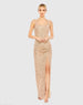 Crafted with a sequined mesh overlay, this gown exudes elegance. Its square halter neckline and low side knot detail above the thigh-high front slit combine to create a show-stopping look. The open back and concealed zipper complete this stunning piece.