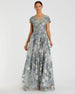 Floral embroidered evening gown with an illusion v-neckline with rhinestone accents. A floor length sweeping train completes this look.