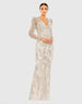 Crafted from intricate embellished fabric, this stunning gown is a showstopper. The long sleeves and v-neckline elevate the elegant design, creating a timeless and sophisticated look.