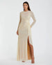 Beige Sequined Ruched Long Sleeve Boat Neck Gown