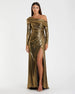 Gold Long Sleeve Off the Shoulder Metallic Gown