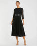 Elegant 3/4 sleeve dress with an A-line pleated tea-length skirt, round neckline, and a dramatic embellished waistband.