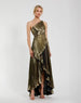 This stunning Pleated Metallic One Shoulder High Low Gown features a unique one shoulder neckline. The pleated metallic fabric adds a touch of glamour, while the high low ruffle hem adds a modern and chic twist. Perfect for any special occasion, this gown is sure to turn heads.