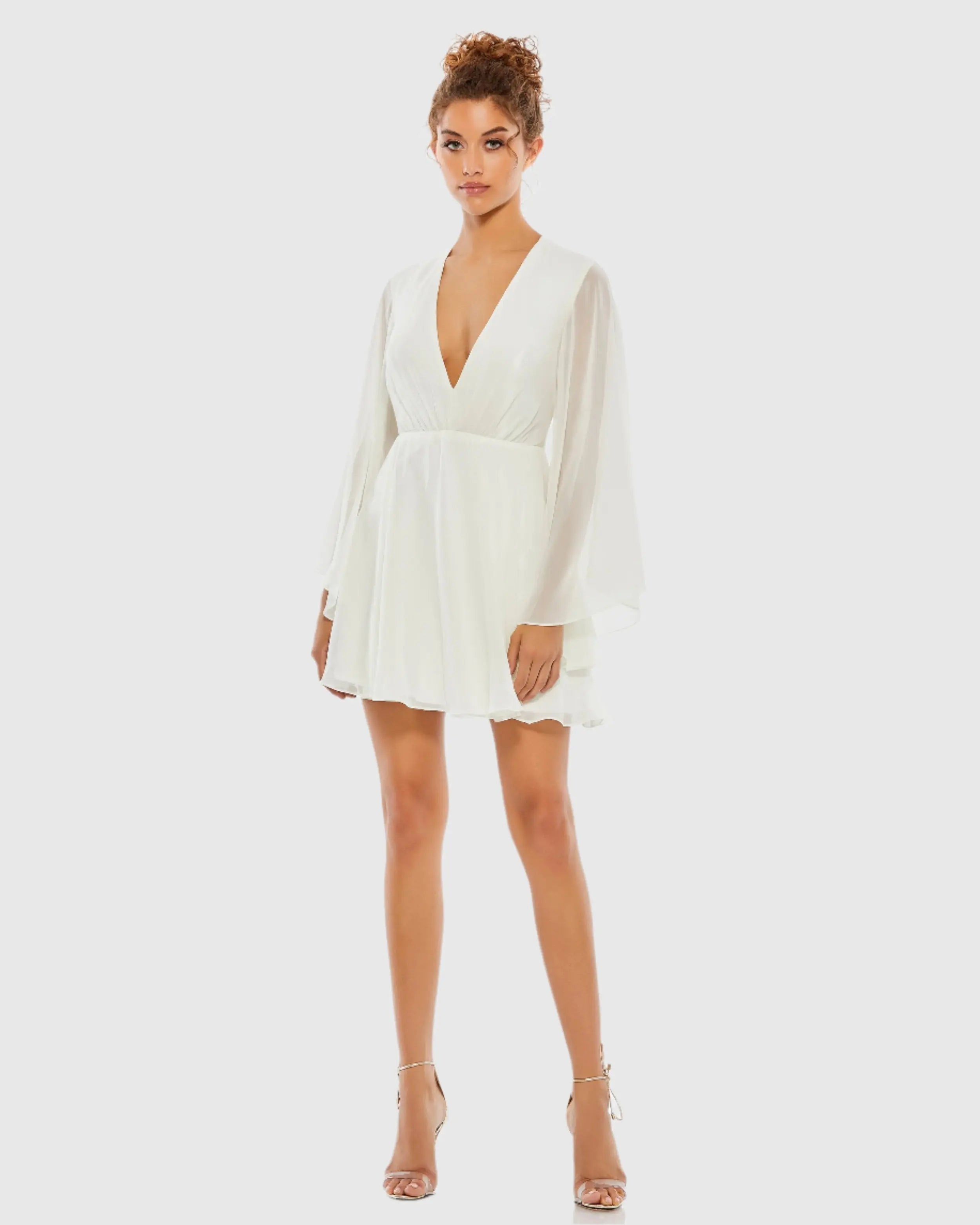 White Solid Flowy V Neck Illusion Sleeve Mini Dress