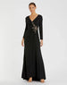 Black Faux Wrap Long Sleeve Evening Gown with Appliqué Detail