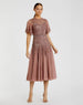 Exquisite hand-embellished mesh overlay dress, featuring a partially lined bodice and a fully lined skirt for a sleek fit. The sheer unlined sleeves add a delicate touch, while the high neckline with an illusion high neck overlay creates a sophisticated, dramatic look. Short flutter sleeves and a rhinestone-encrusted waist detail complete the design, making this dress perfect for formal events, galas, or evening soirées.