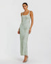 This dazzling gown features embellished mesh fabric with a scoop neckline and sleeveless design. Delicate spaghetti straps and a beaded bow design throughout add a unique touch, while the allover sequin pattern creates a glamorous, sparkling effect, making it perfect for any special event.