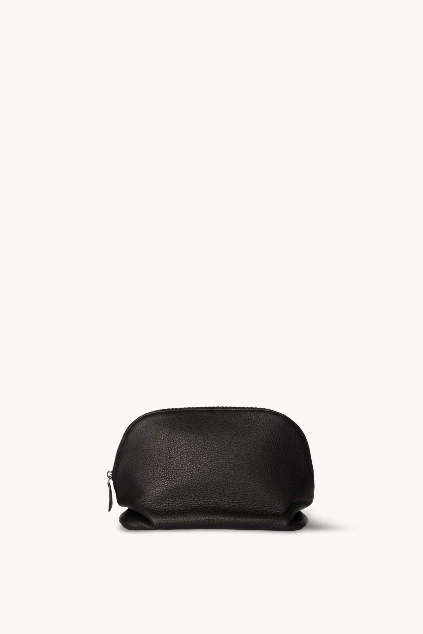 Geometric clutch in pebbled calfskin leather with softly slouched base, embossed logo on side, and zipper closure.