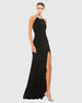 Elegant jersey gown accented with a bead-and-rhinestone embellished halter neck and a thigh-high slit.