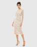 Elegant illusion-sleeved cocktail dress with a high neckline, fitted bodice, and a straight midi-length skirt. This long-sleeve shift dress features sequin-and-bead floral embellishments throughout, and hand-beaded accents define the natural waist.