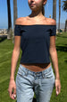 Cotton blend off the shoulder short sleeve crop top with raw hem.