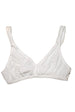 White bra with scalloped trim and straps, white bow, a seam under the bust and hook-and-eye closure.