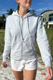 Basic, zip-up hoodie in burgundy with two pockets and a drawstring hood.