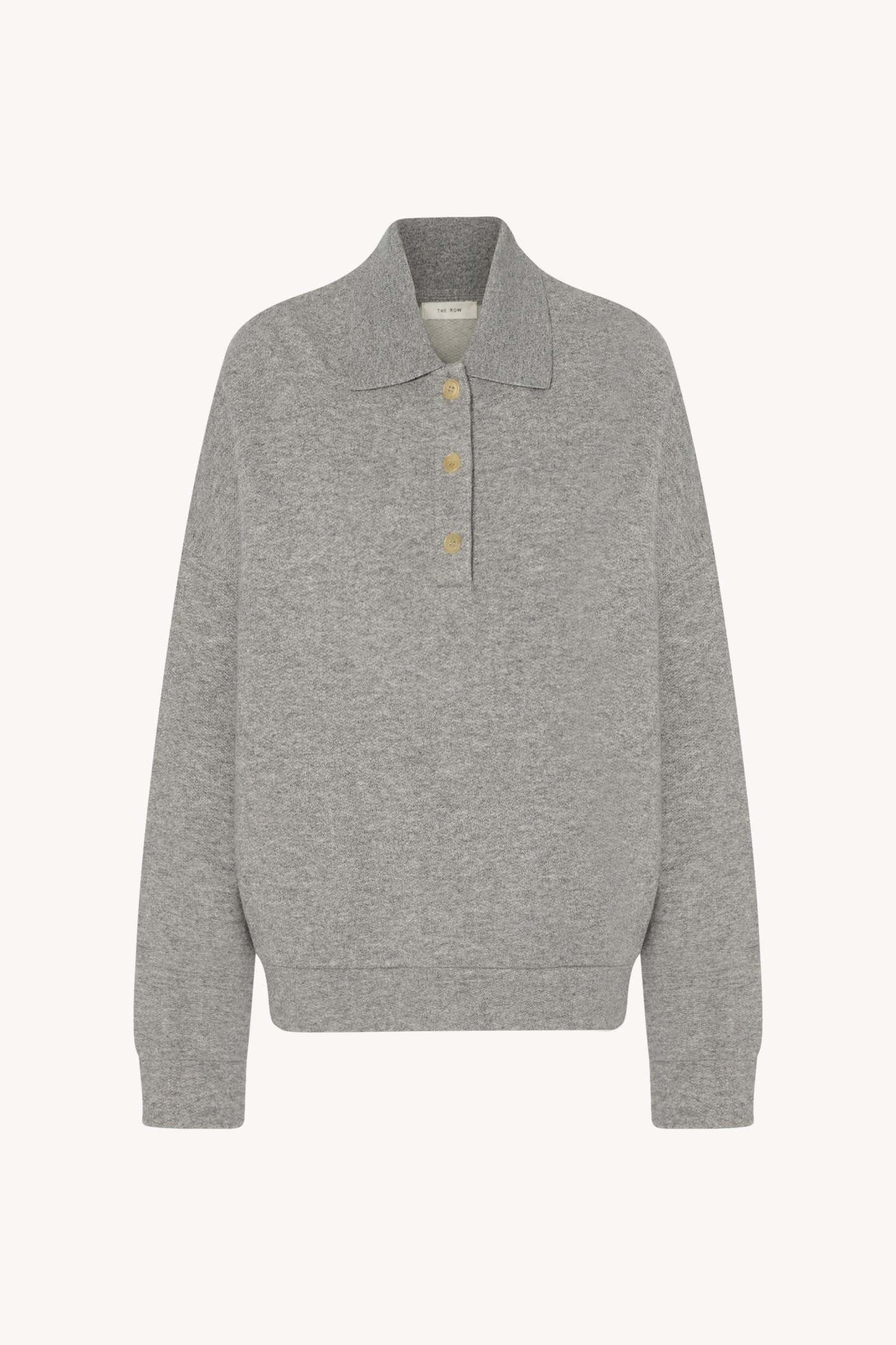 Relaxed long-sleeved polo top in cashmere and cotton French terry with dropped shoulders, ribbed collar, and exposed front button placket.