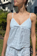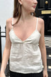 Flowy tank top with v-neck, scalloped trim, adjustable straps, and tie in the back