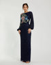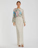 Adorned with intricate embellishments and a vibrant floral pattern, this gown exudes elegance and charm. The high neckline adds sophistication, while the multi-color design brings vibrancy and life to the ensemble.