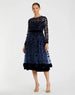 Elegant tea-length cocktail dress with a semi-sheer illusion yoke and sleeves, tulle overlay skirt, and intricate velvet floral accents and beading throughout. A tonal velvet band accents the natural waist, and the skirt is finished with a velvet-trimmed bottom hem.