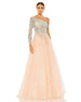 Inspired by constellations in the starry night sky, the embroidery on this dress is detailed with miniature twinkling rhinestones. The statement ballgown boasts an asymmetrical neckline with a single wrist-length sleeve, sheer bodice with enchanting leaf appliqué, and a full tulle skirt fit for any princess.