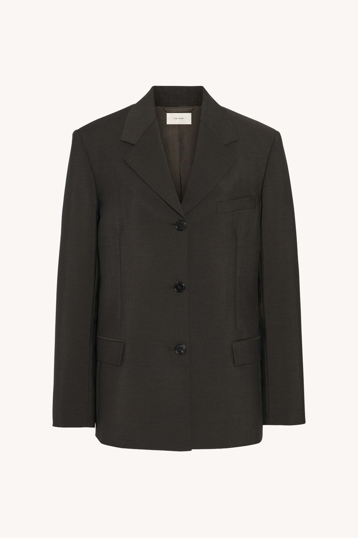 Structured single-breasted jacket in lightweight virgin wool and mohair with notch lapel, front flap pockets, and horn button closure.