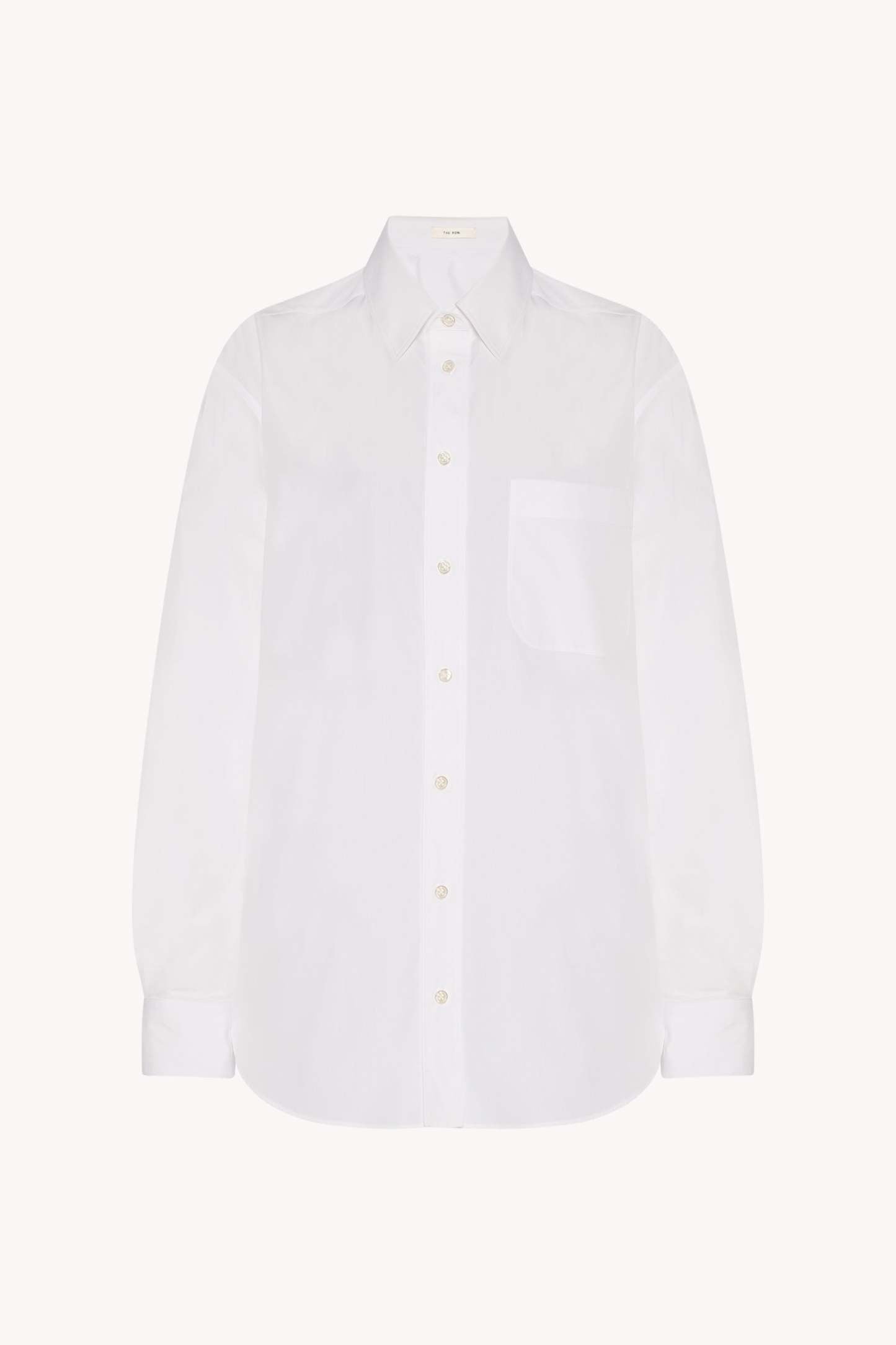 Classic button-up shirt in smooth sea island cotton chambray with front patch pocket, slim back yoke, and exposed front button placket.