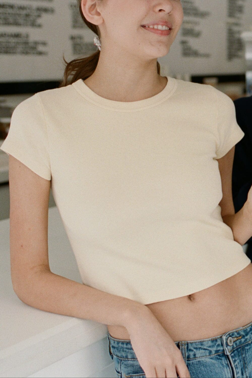Fitted, cropped short sleeve tee with a crewneck collar.