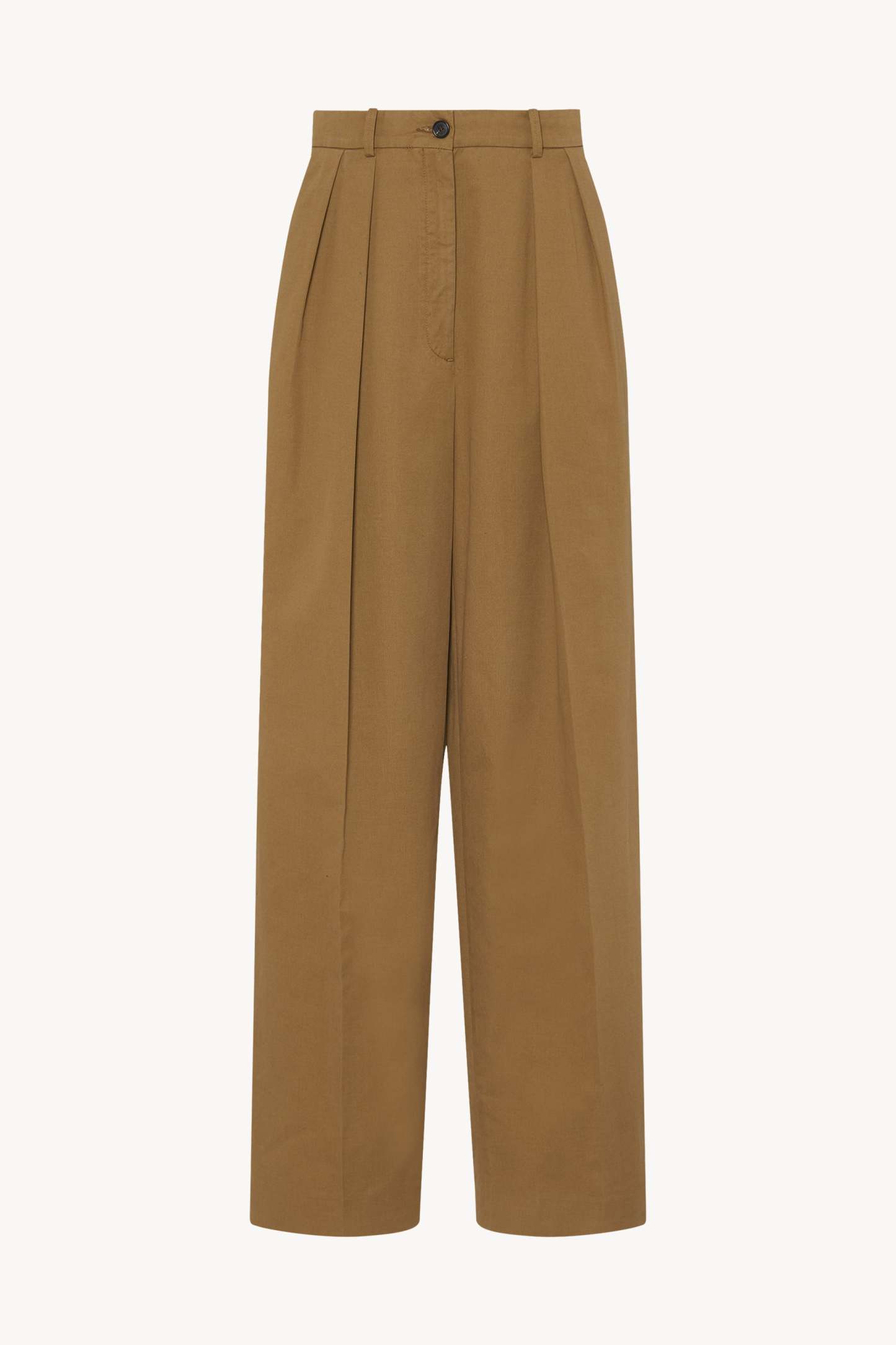 Low-rise trouser in cotton and cashmere gabardine with wide straight leg, front double pleats, and slanted side pockets.