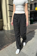 Relaxed straight-leg cargo pants with adjustable elastic bands at the waist and legs, front and back pockets and patch pockets on the side.