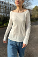 Wide scoop neck, long sleeve top with a lace trim.
