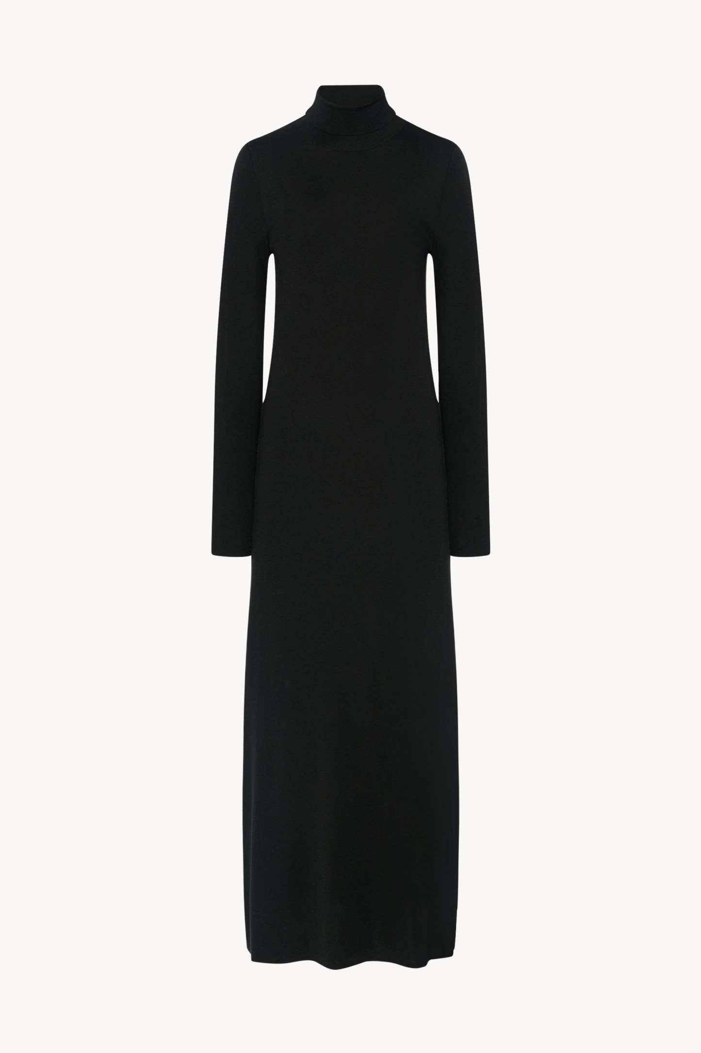 Ankle-length long-sleeved dress in ultrafine wool jersey with fitted silhouette, high turtleneck, and exposed seam finish.