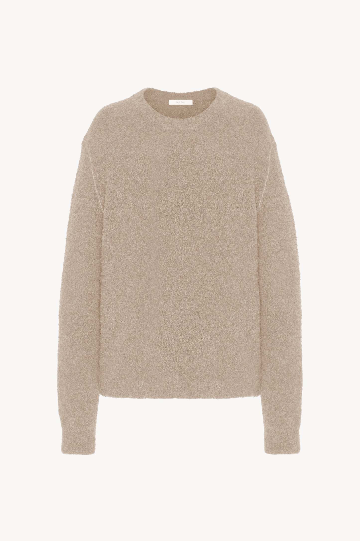 Relaxed crewneck sweater in textured alpaca and cashmere bouclé with topstitched armholes and ribbed neckline, cuffs, and hem.