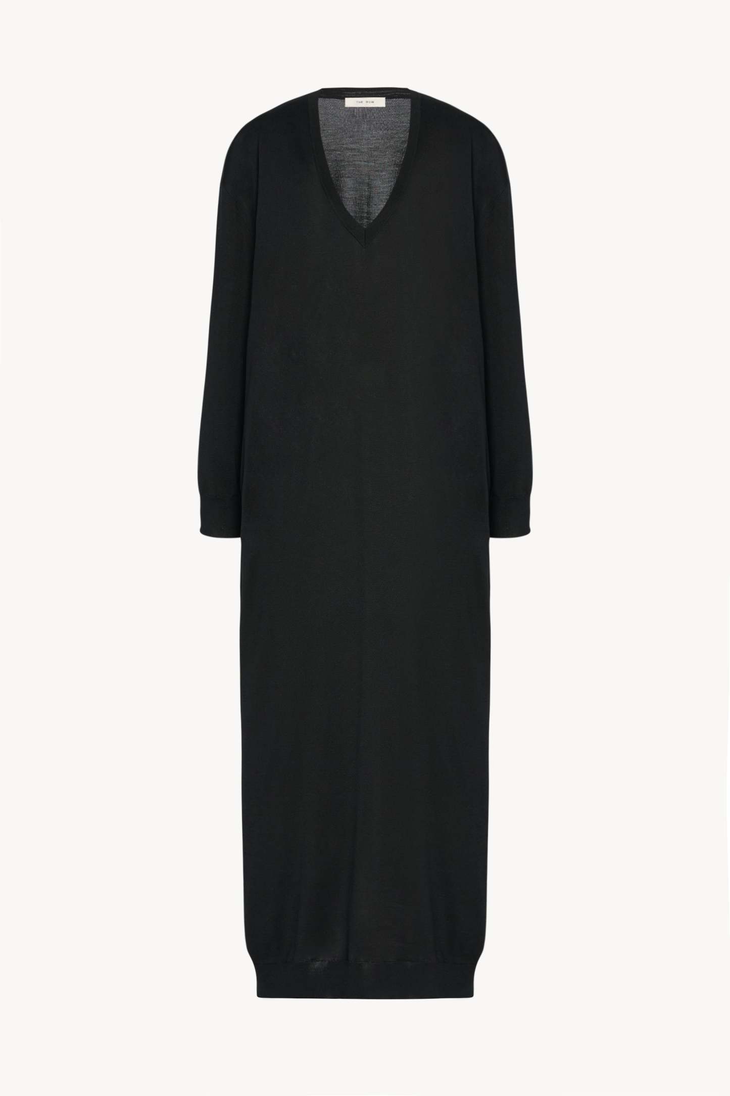 Ankle-length long-sleeved dress in finely knit silk with relaxed silhouette, deep v-neck, and ribbed neckline, cuffs, and hem.
