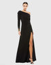 Off-the-shoulder long sleeve jersey gown accented with jeweled cuffs and a thigh-high slit.