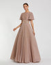 This elegant gown features flutter sleeves, a flattering ball gown silhouette, and shimmering lurex fabric. Perfect for any special occasion, the short flutter sleeves add a touch of romance while the shimmering fabric catches the light for a stunning look.