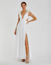 This striking gown features a plunging neckline, feather shoulder detailing, and a thigh-high slit.