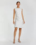 Stunning charmeuse mini dress with fitted waist detailing and a rhinestone trimmed high neckline.