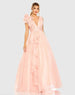 V-neck sleeveless ball gown with ruffled shoulder ruched empire waist and ruffles flowing down the skirt.