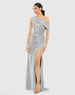 Sequined off-the-shoulder evening gown with a fitted ruched bodice. The floor-length skirt features a sweeping train and a sexy thigh-high slit.