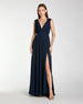 Ruched chiffon gown with a plunging v-neckline and thigh high slit.